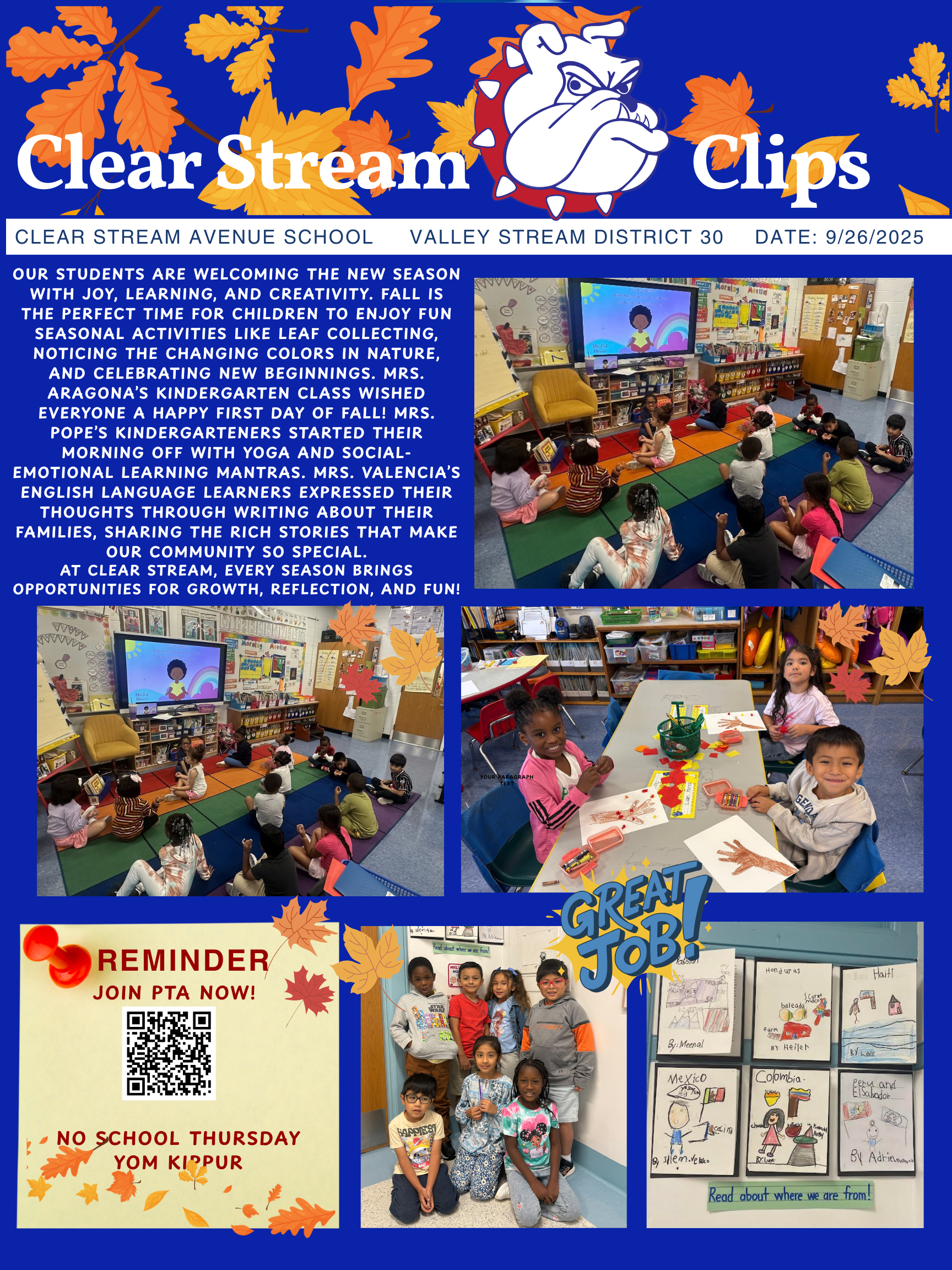 Clear Stream Avenue School continues to excel academically, with students consistently achieving high scores and demonstrating exceptional growth across all grade levels. A strong emphasis on reading, science, and mathematics throughout the school year ensures that students build critical thinking skills, creativity, and problem-solving abilities that prepare them for future success. This commitment to academic excellence reflects the dedication of both staff and students in fostering a love for learning and a culture of achievement. Please note the following important changes: