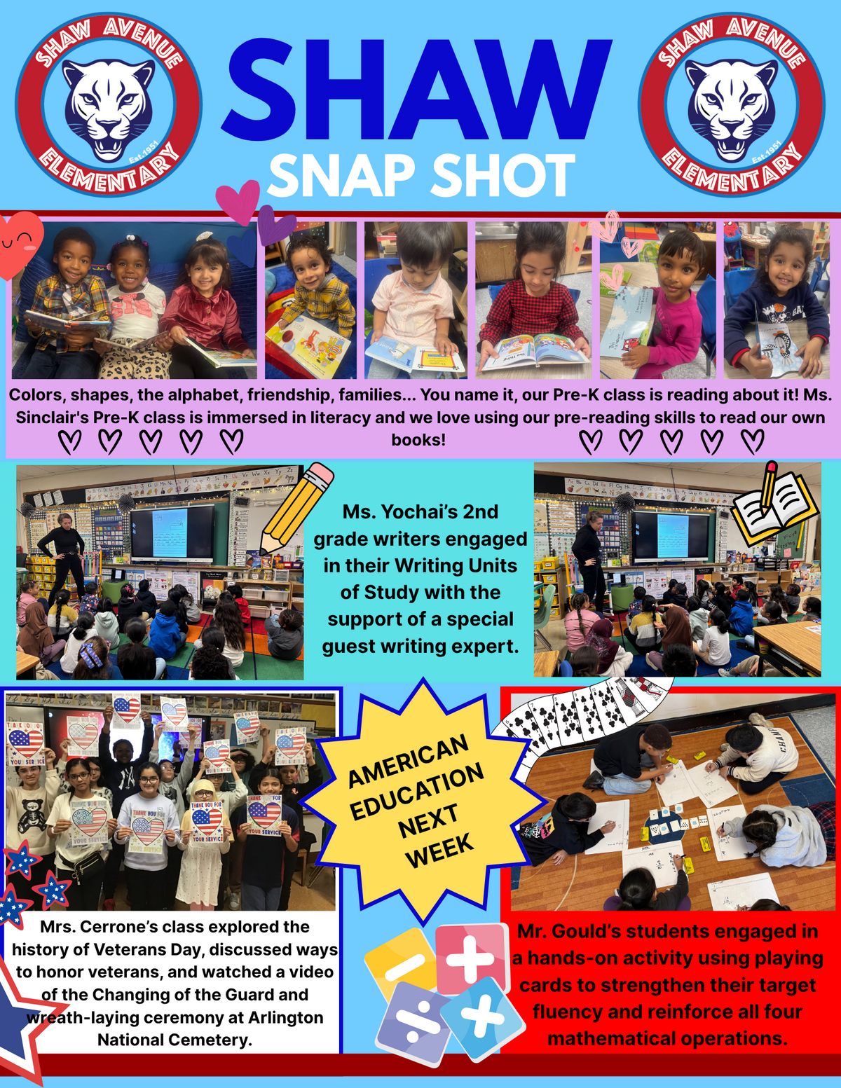 • Shaw Avenue Elementary School opened in 1950 as the second school in Valley Stream District 30, replacing the Rottkamp Potato Farm. For its 50th anniversary in 2000, students, staff, and families placed two time capsules in the Library Media Center to be opened in 2050 unveiled during Shaw Avenue’s 100th anniversary. Today, Shaw serves a diverse K–6 student body in the northern region. Students receive a strong foundation academically, socially, and emotionally. Instruction is differentiated to meet learning styles using varied strategies. Our core program emphasizes literacy through Common Core-aligned instruction, focusing on phonics, fluency, vocabulary, and comprehension. In math, students apply real-world reasoning and problem-solving. Science and social studies foster inquiry and literacy integration. Students also grow through music, art, technology, and SEL. Enrichment includes tech labs, full-day kindergarten, co-teaching, QUEST, and afterschool supports.